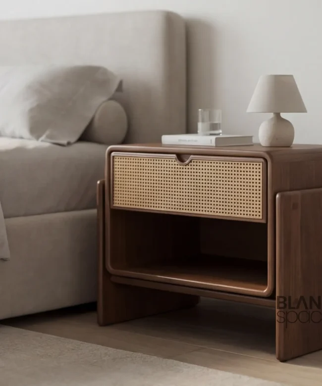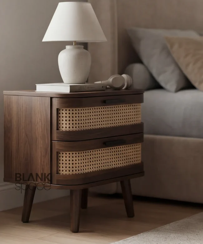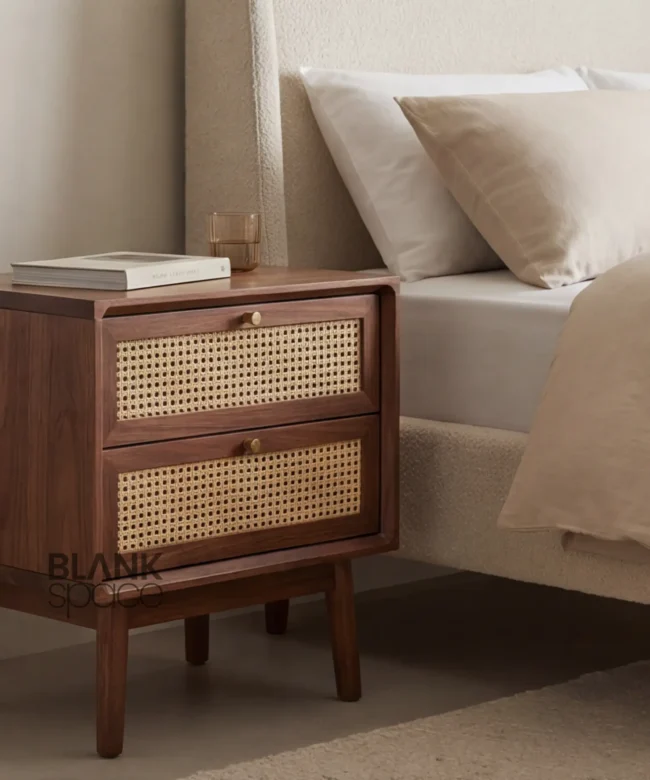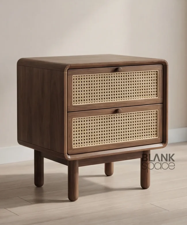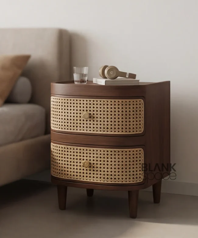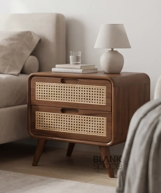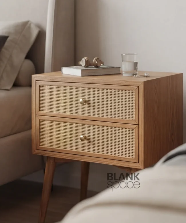 Solid wood construction Natural cane (rattan) drawer panels Two functional storage drawers Compact, space-saving design Raised wooden legs for a light, modern look Durable, timeless, and easy to style Care…