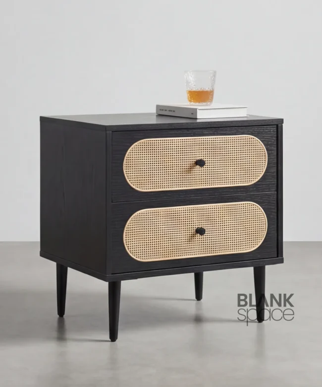 Solid wood body with premium black finish Two drawers with handwoven cane fronts Smooth drawer operation Mid-century inspired tapered legs Strong, stable, and stylish design Care Instructions Clean with a…