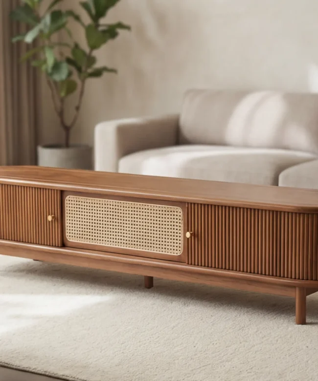 A refined media console crafted in solid teakwood with handcrafted cane-front doors, designed to bring warmth, balance, and timeless sophistication to modern living rooms.