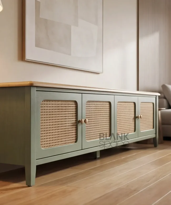 Elegant sage green wooden finish Natural cane (rattan) door panels Minimal round knobs for easy access Strong, stable base with floor clearance Ventilated storage for electronics Easy to clean and…