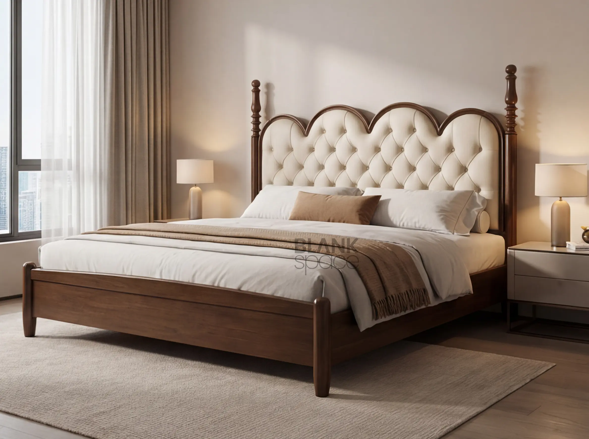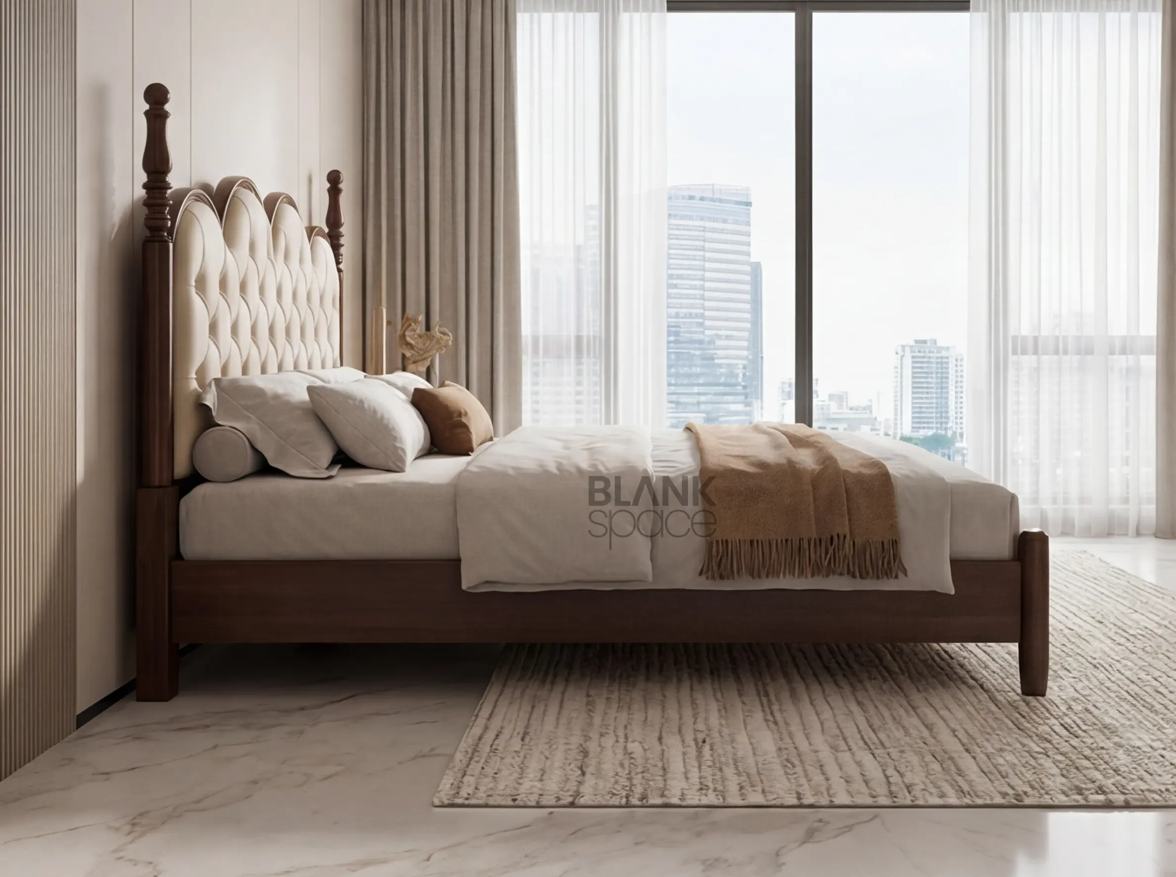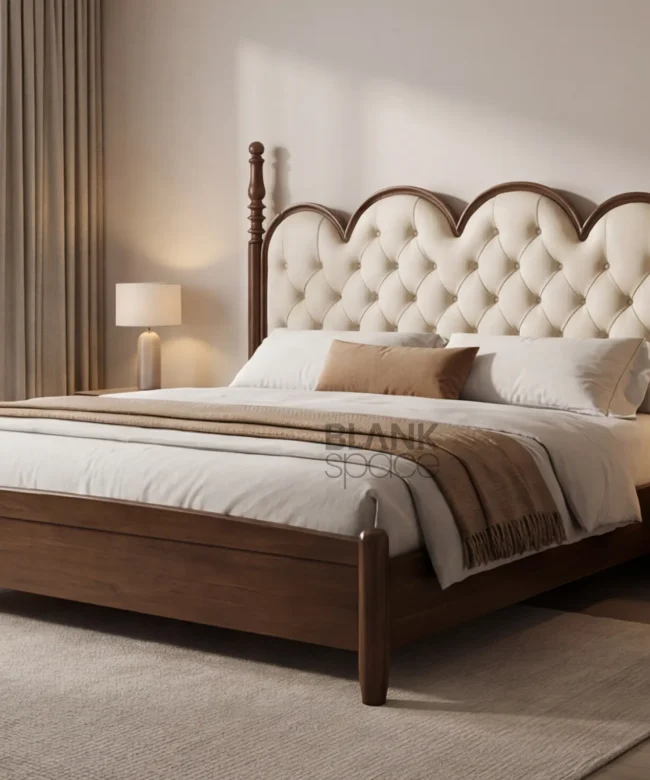 Enhance your bedroom with this beautifully crafted solid wood bed, featuring a luxurious scalloped, button-tufted upholstered headboard. Designed to blend timeless elegance with everyday comfort, this bed is perfect for sophisticated homes, premium apartments, and luxury hospitality spaces.