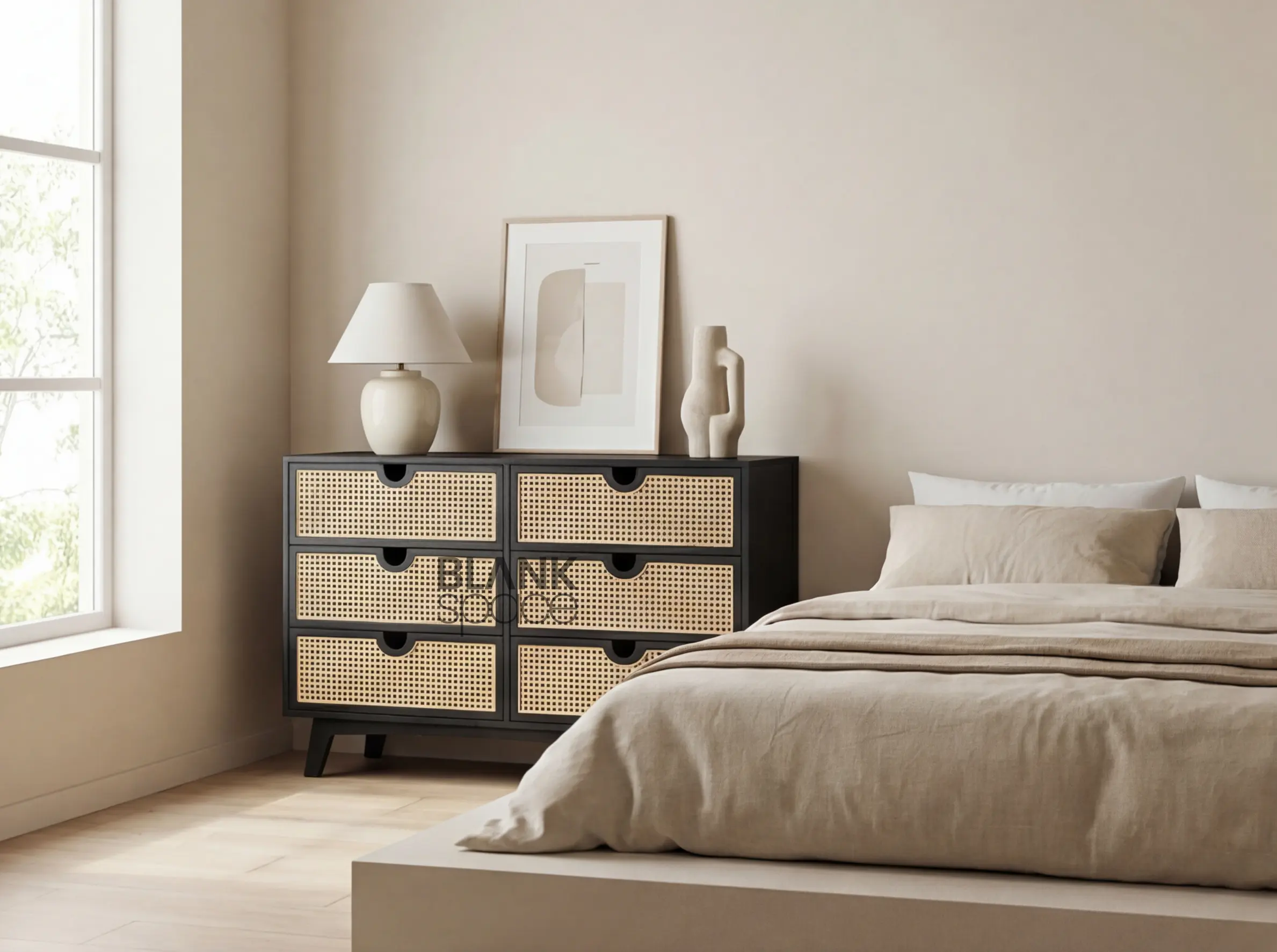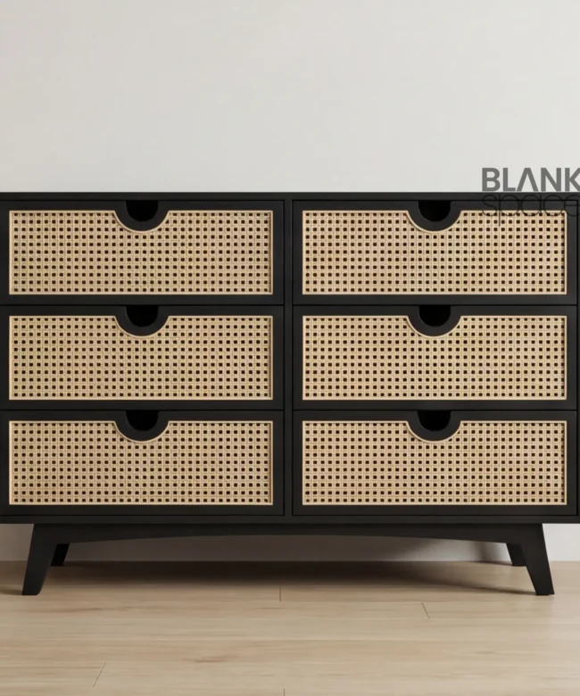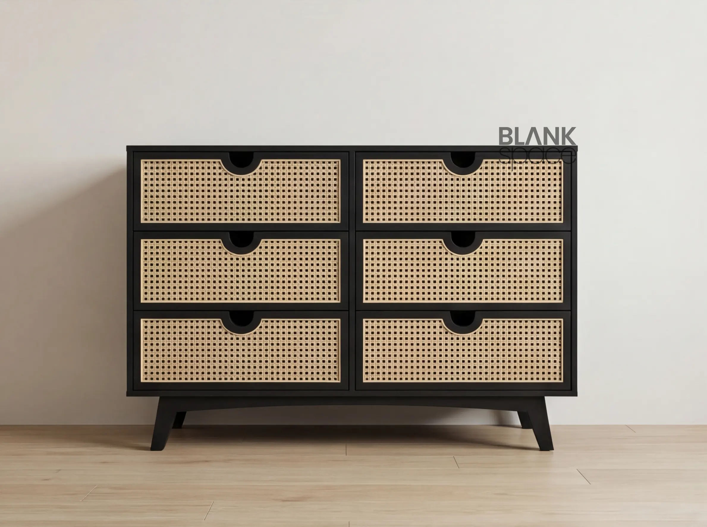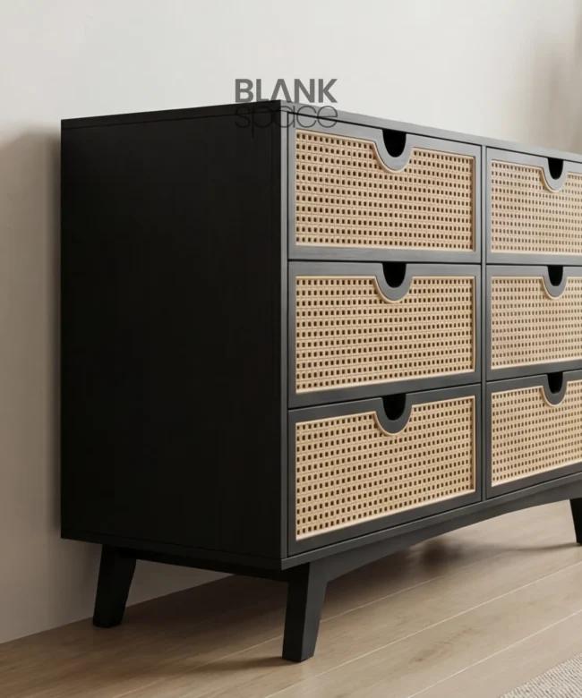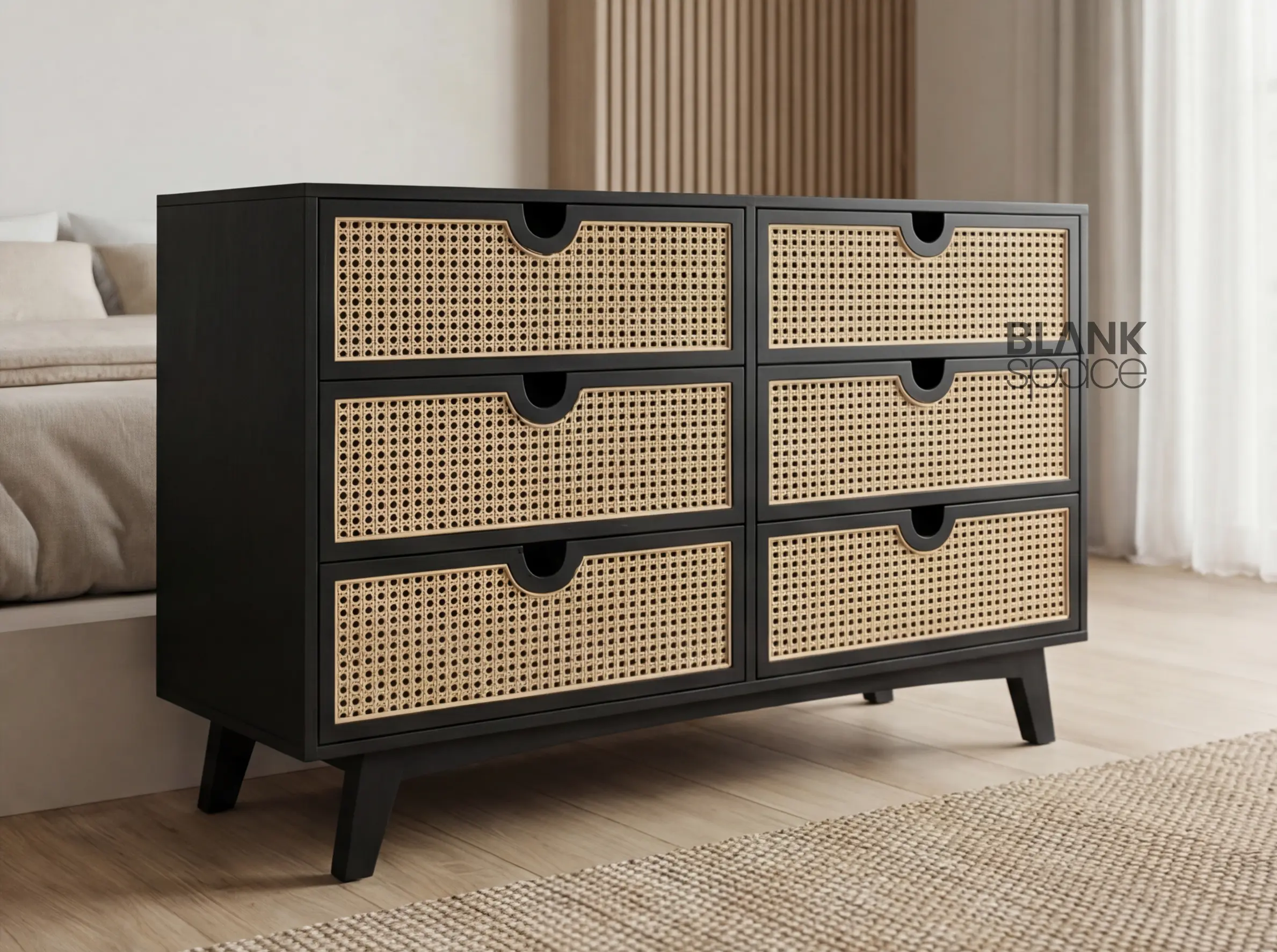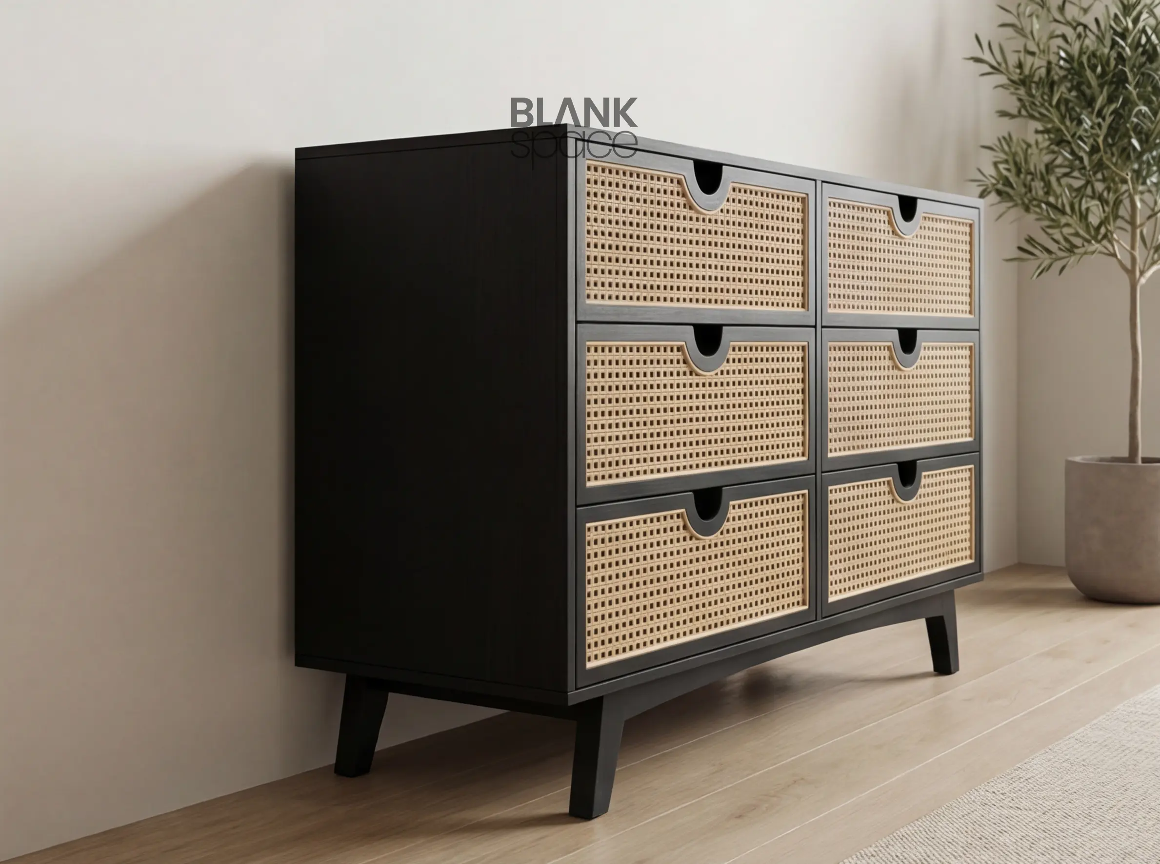 This dresser features a sleek matte black frame contrasted by woven cane drawer panels, creating a refined yet relaxed look. The recessed half-moon drawer pulls maintain a clean, handle-free profile while adding subtle visual interest. Slightly tapered legs lift the unit off the floor, giving it a light, contemporary feel.