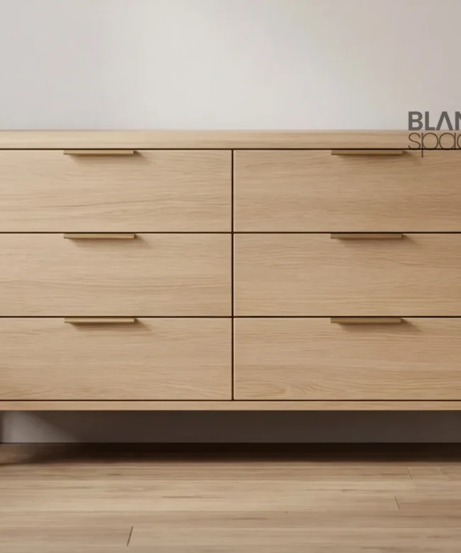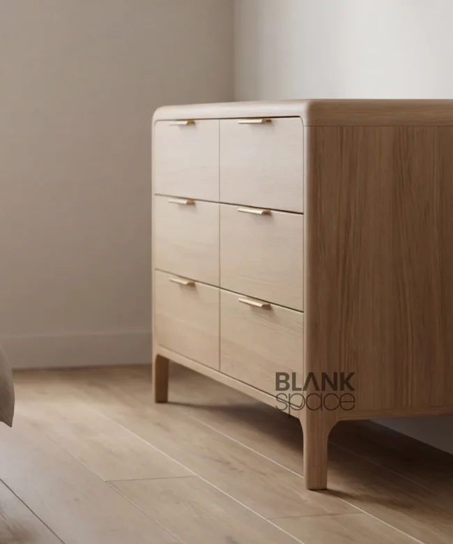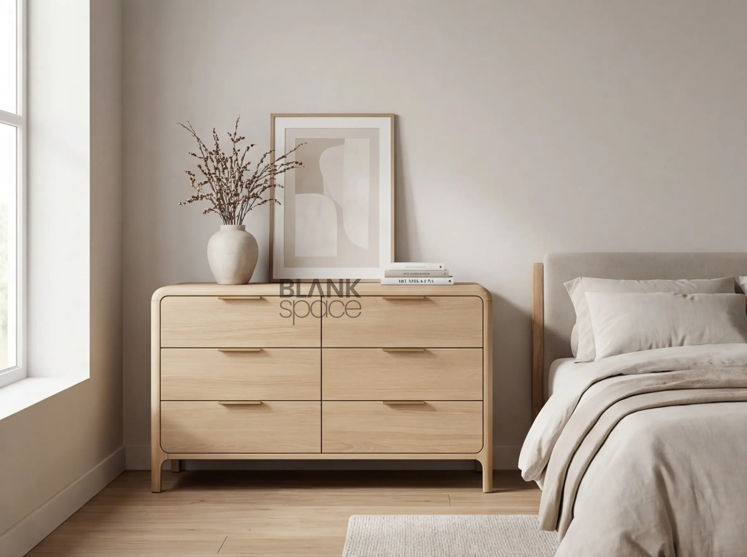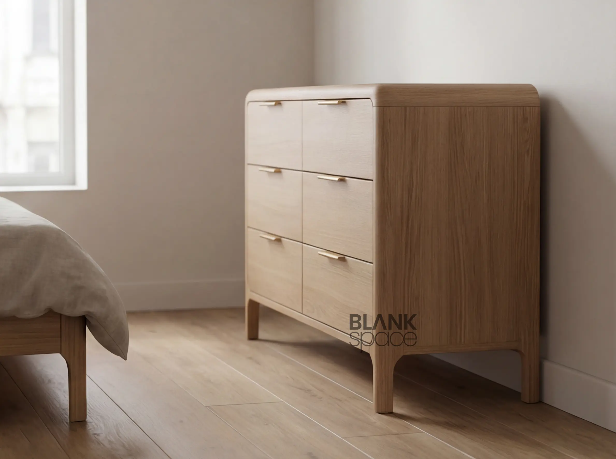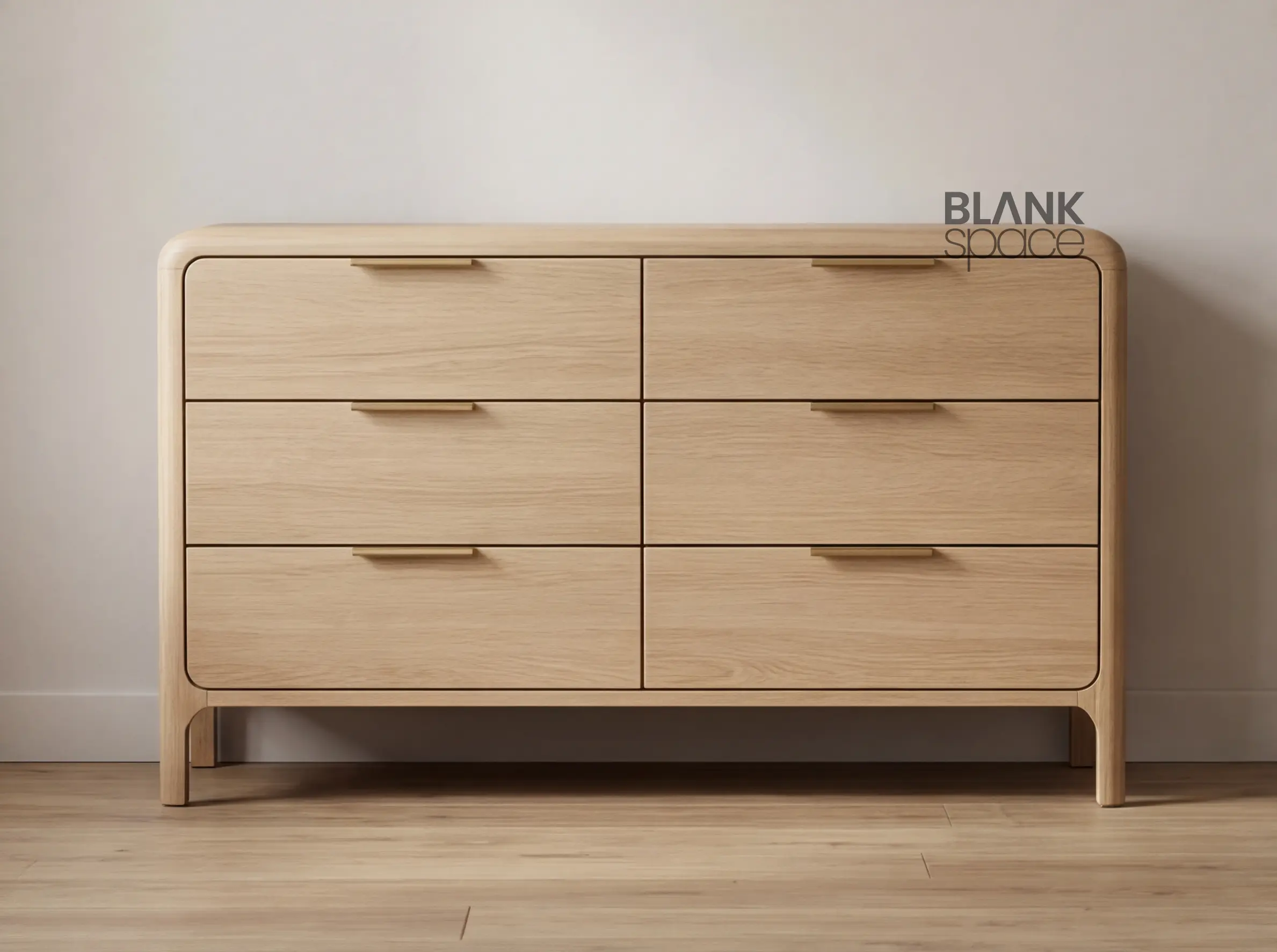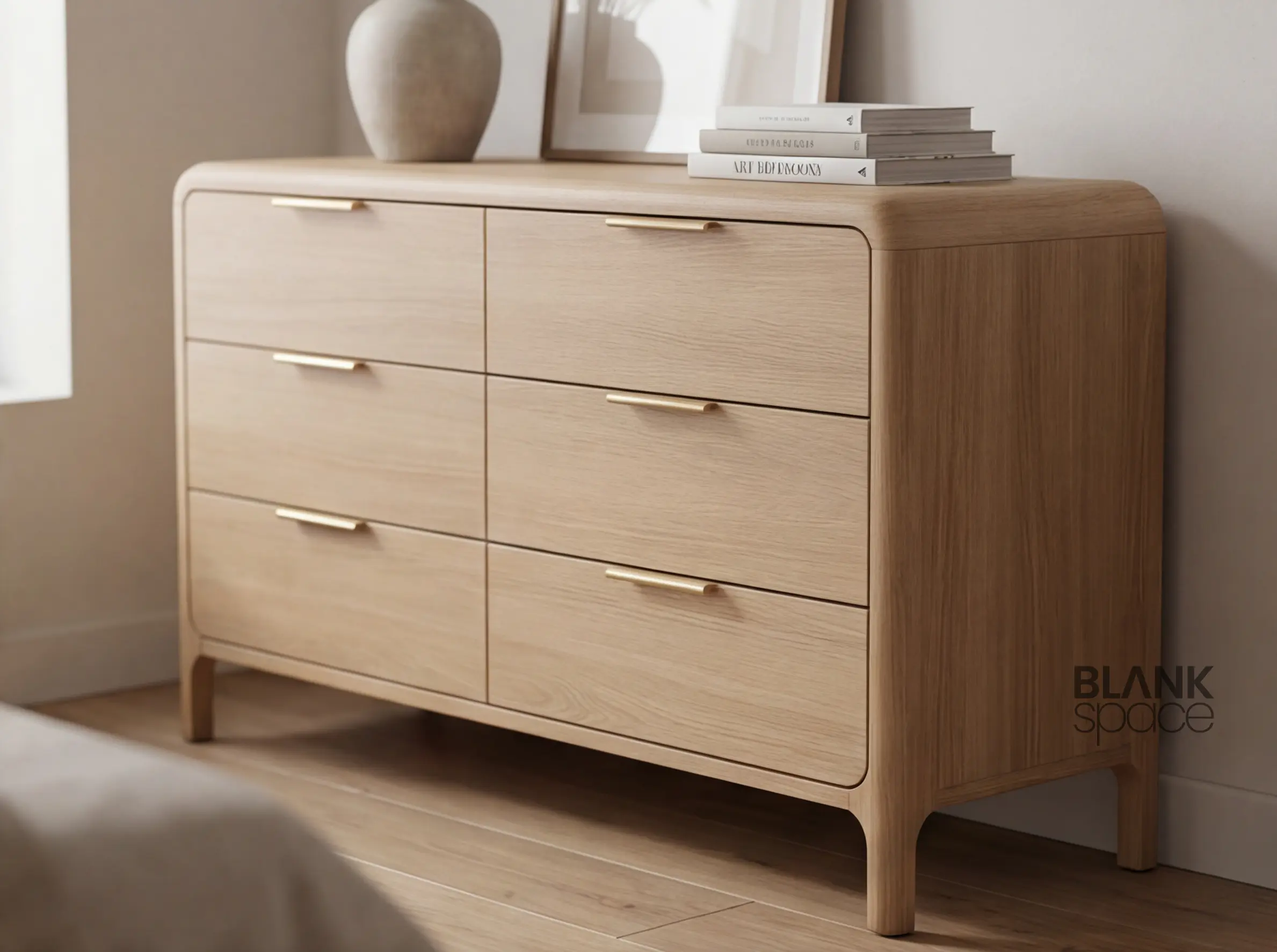 Crafted in a soft light oak tone, this dresser highlights the natural beauty of wood grain. The smooth, rounded corners and slim brushed brass handles add a refined, modern touch without overpowering the design. Its balanced proportions make it visually light yet substantial.