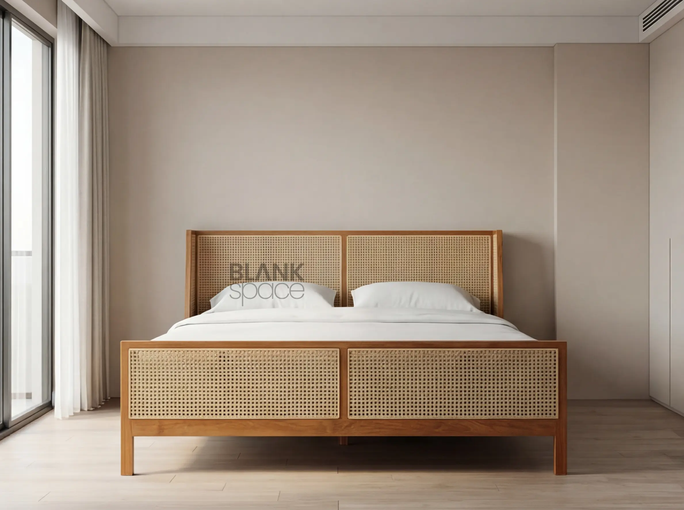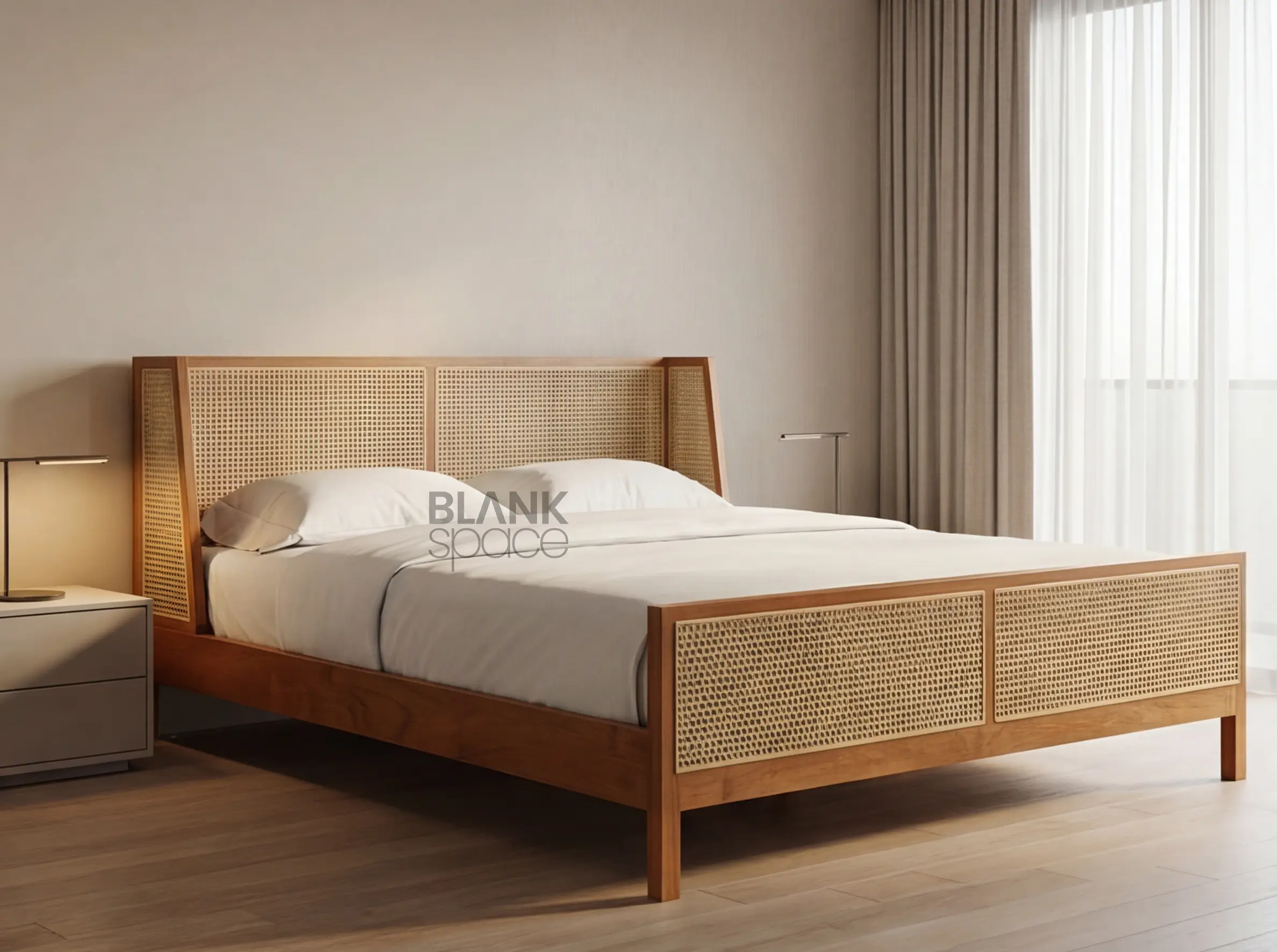 Its neutral wood and cane combination pairs beautifully with white, beige, linen, and earth-toned bedding.