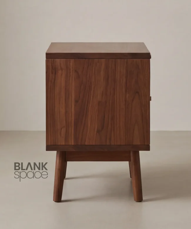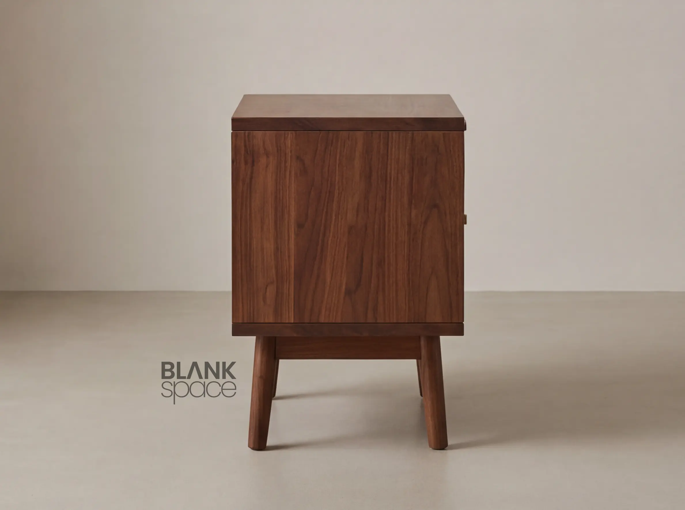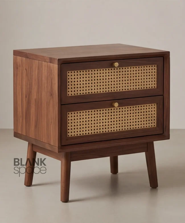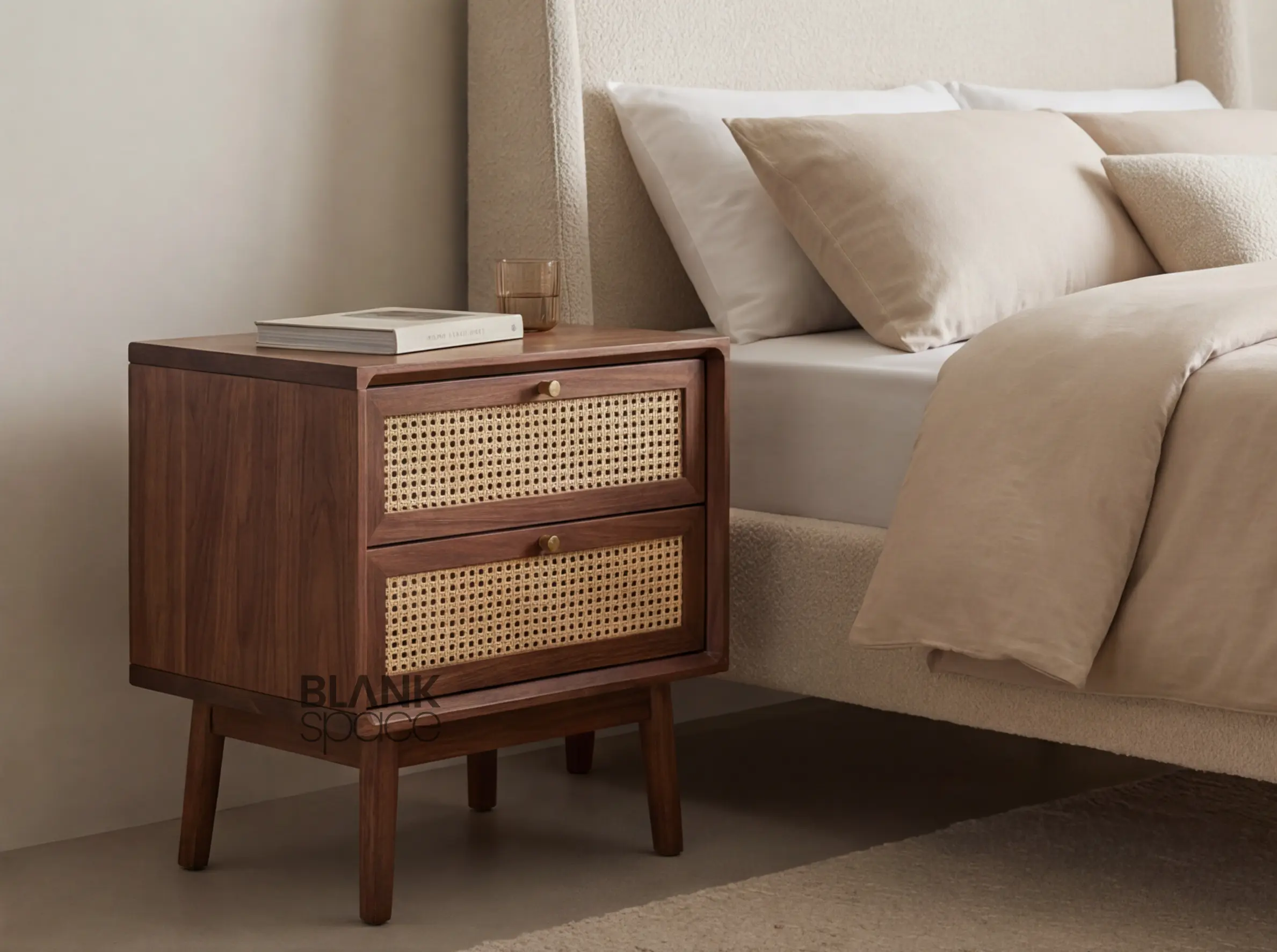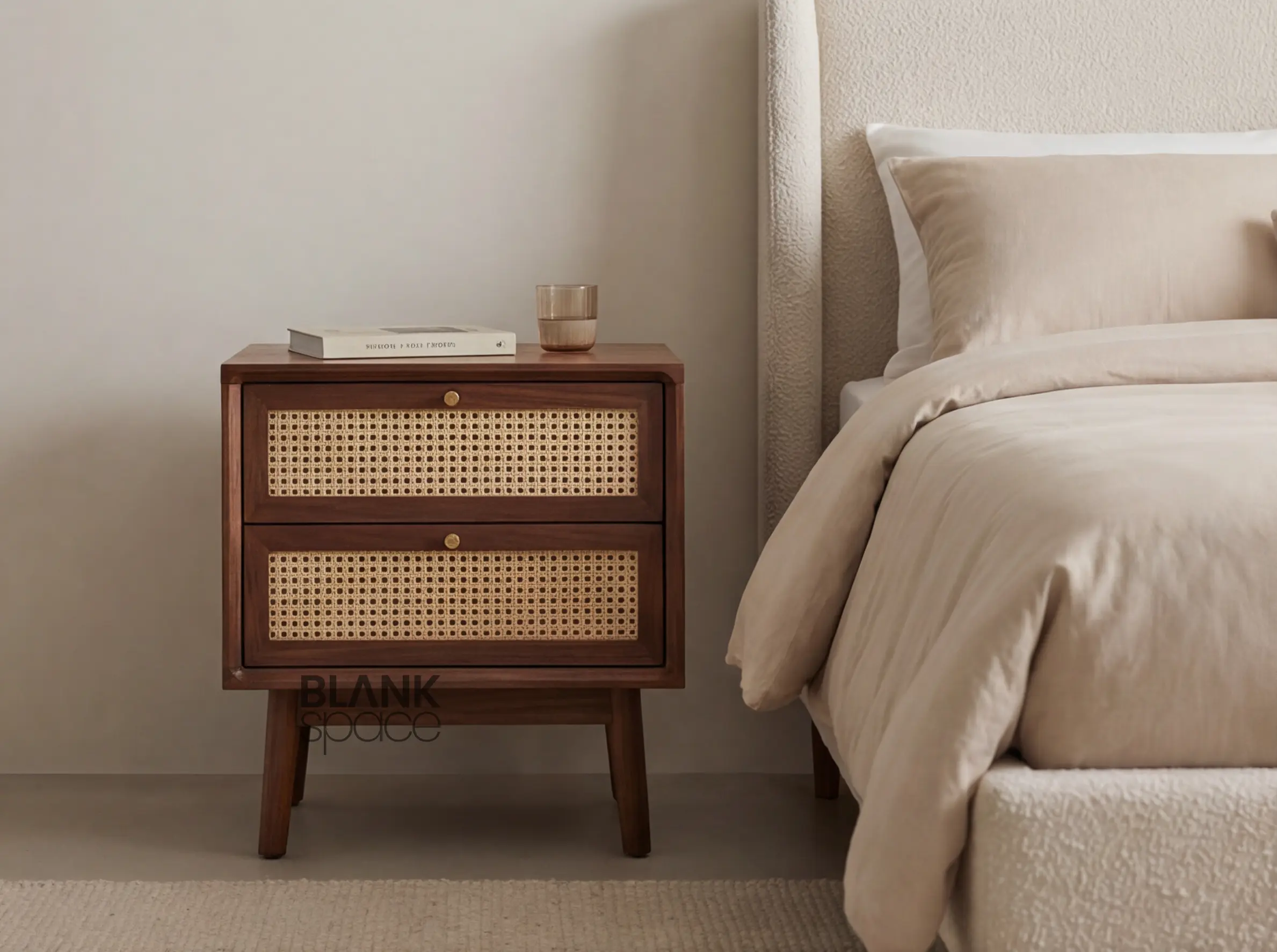 This bedside table features a clean, boxy silhouette softened by smooth edges and warm wood grain. The natural cane drawer fronts introduce texture and visual interest, creating a calm, airy feel that complements modern, mid-century, Scandinavian, and contemporary interiors. Subtle round metal knobs add a refined finishing touch without overpowering the design.