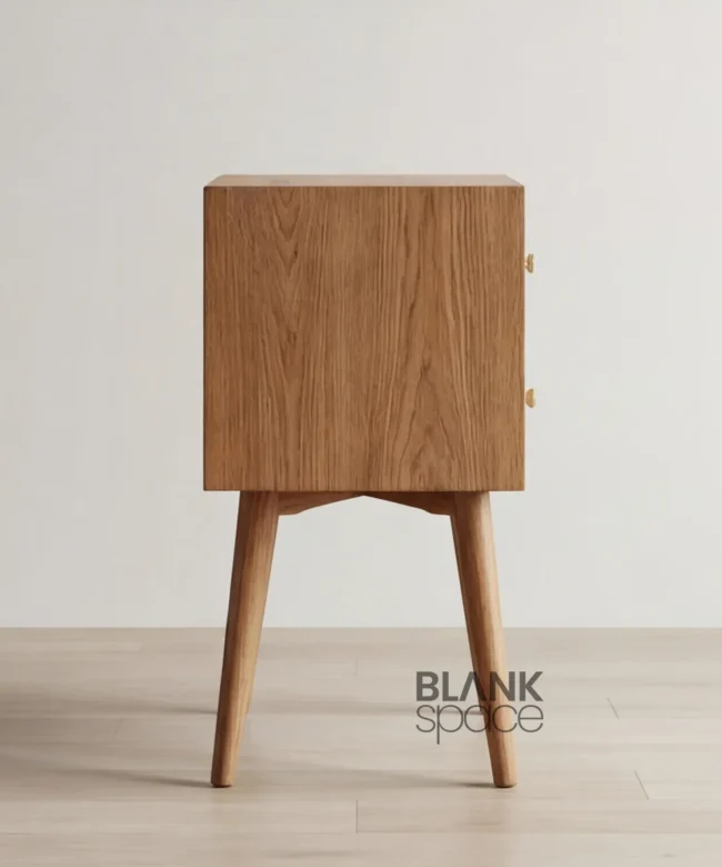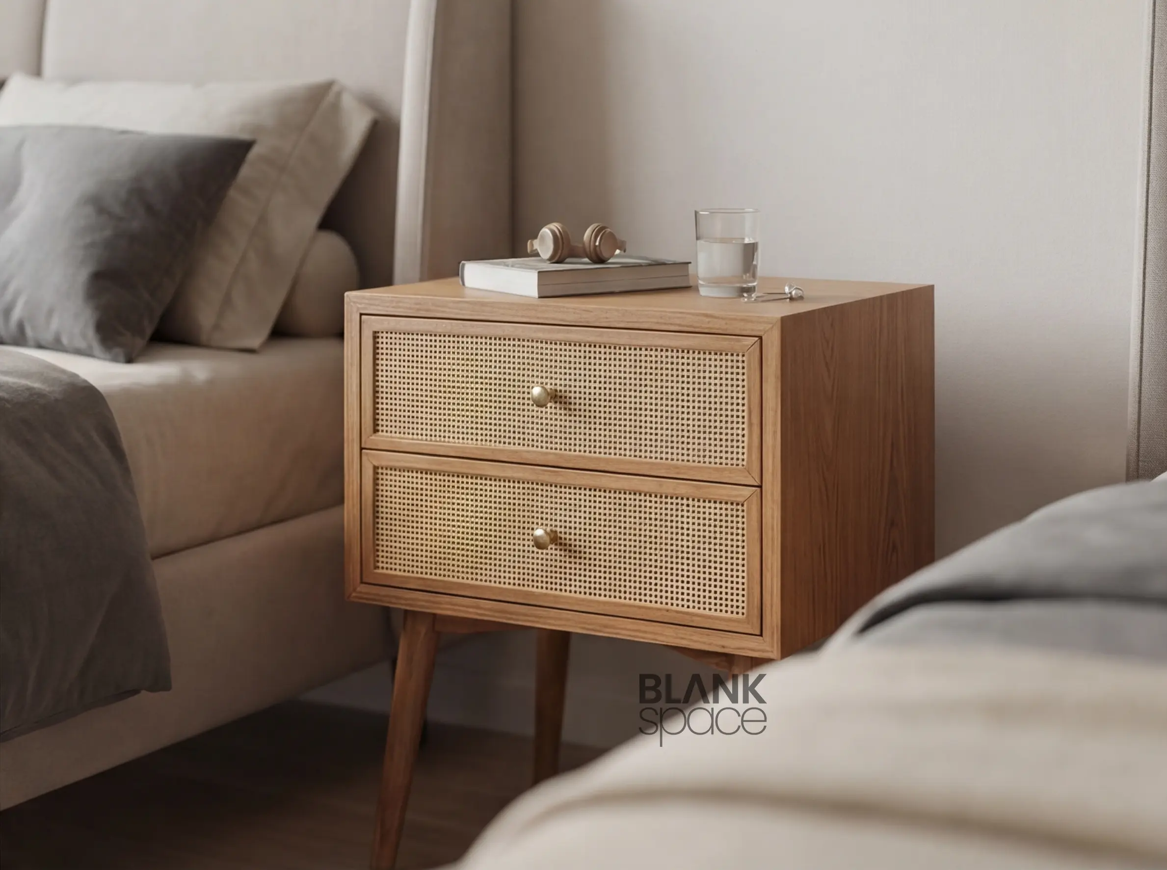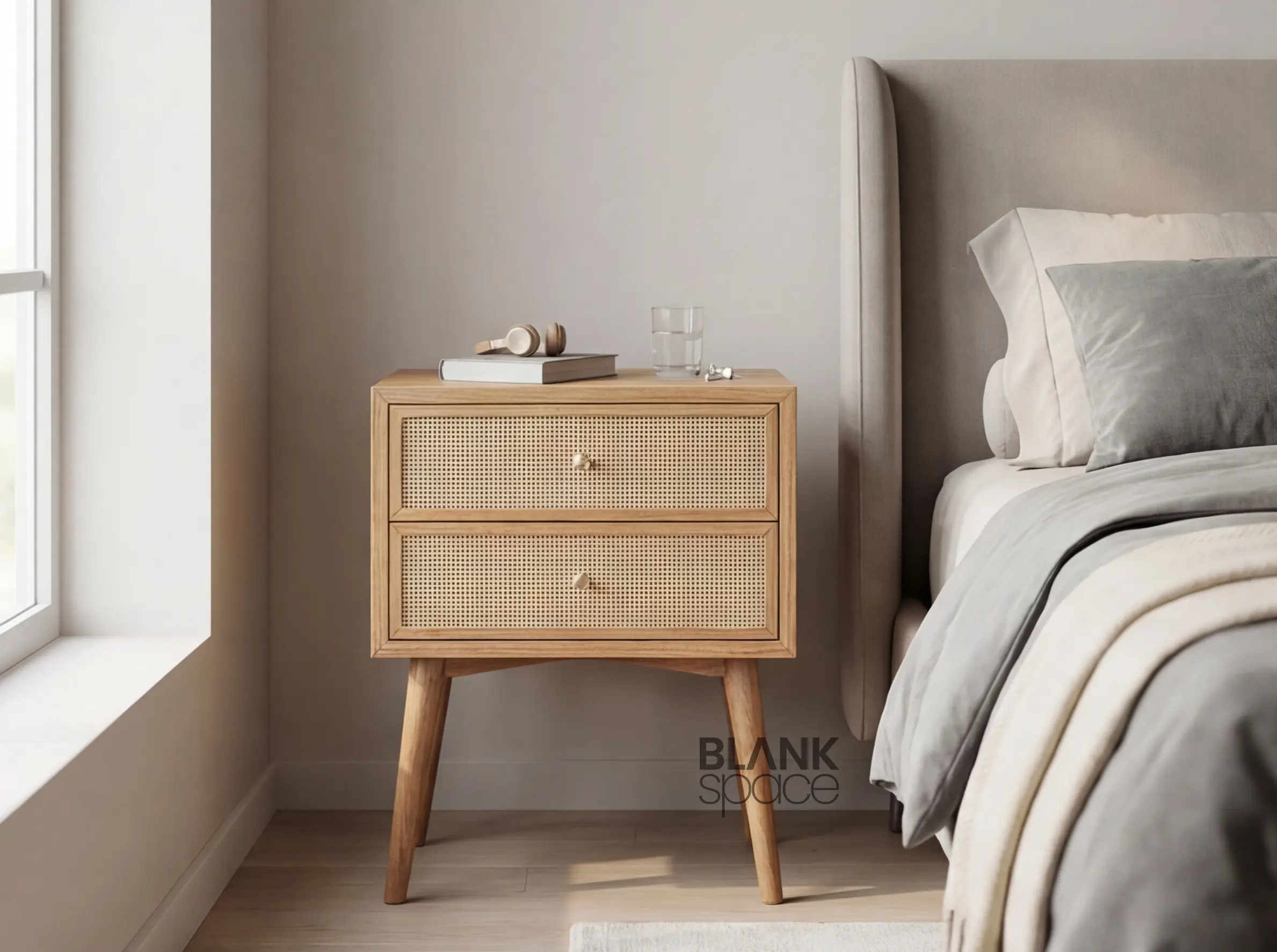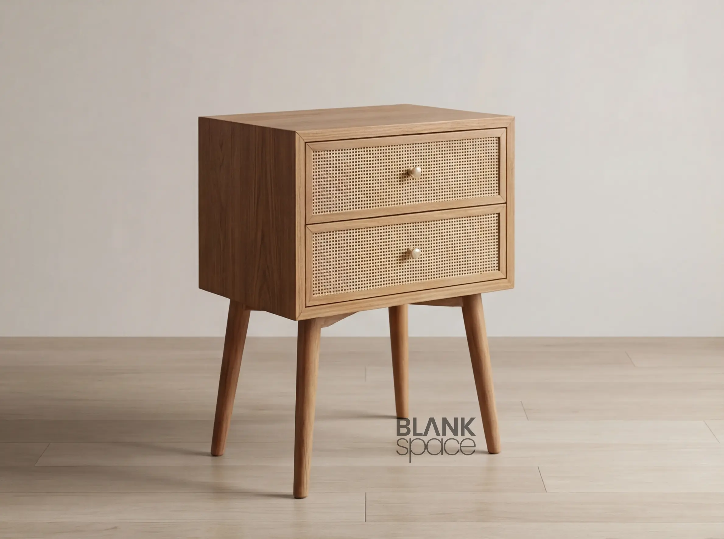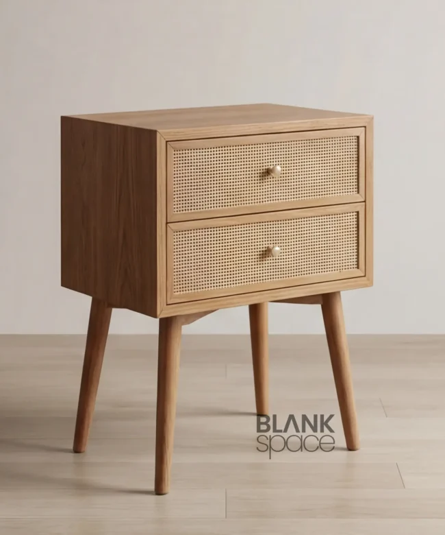 This bedside table showcases a compact rectangular form elevated on tapered solid wood legs, giving it a light and airy presence. The woven cane drawer panels add natural texture and visual interest, while the smooth wooden frame and rounded edges maintain a refined, premium look. Subtle round knobs enhance usability without overpowering the design.