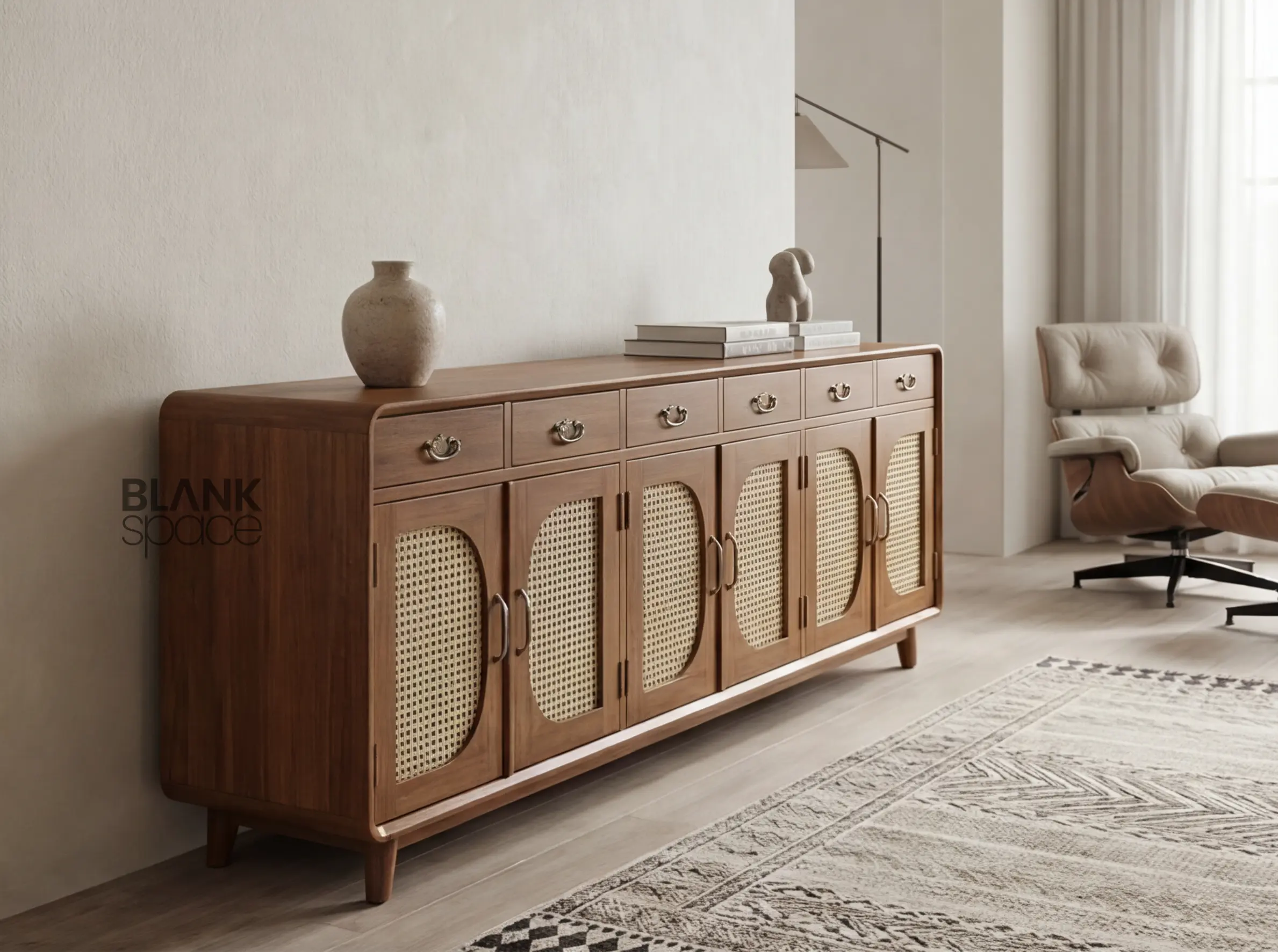 Handwoven cane (rattan) panels add texture, breathability, and visual lightness