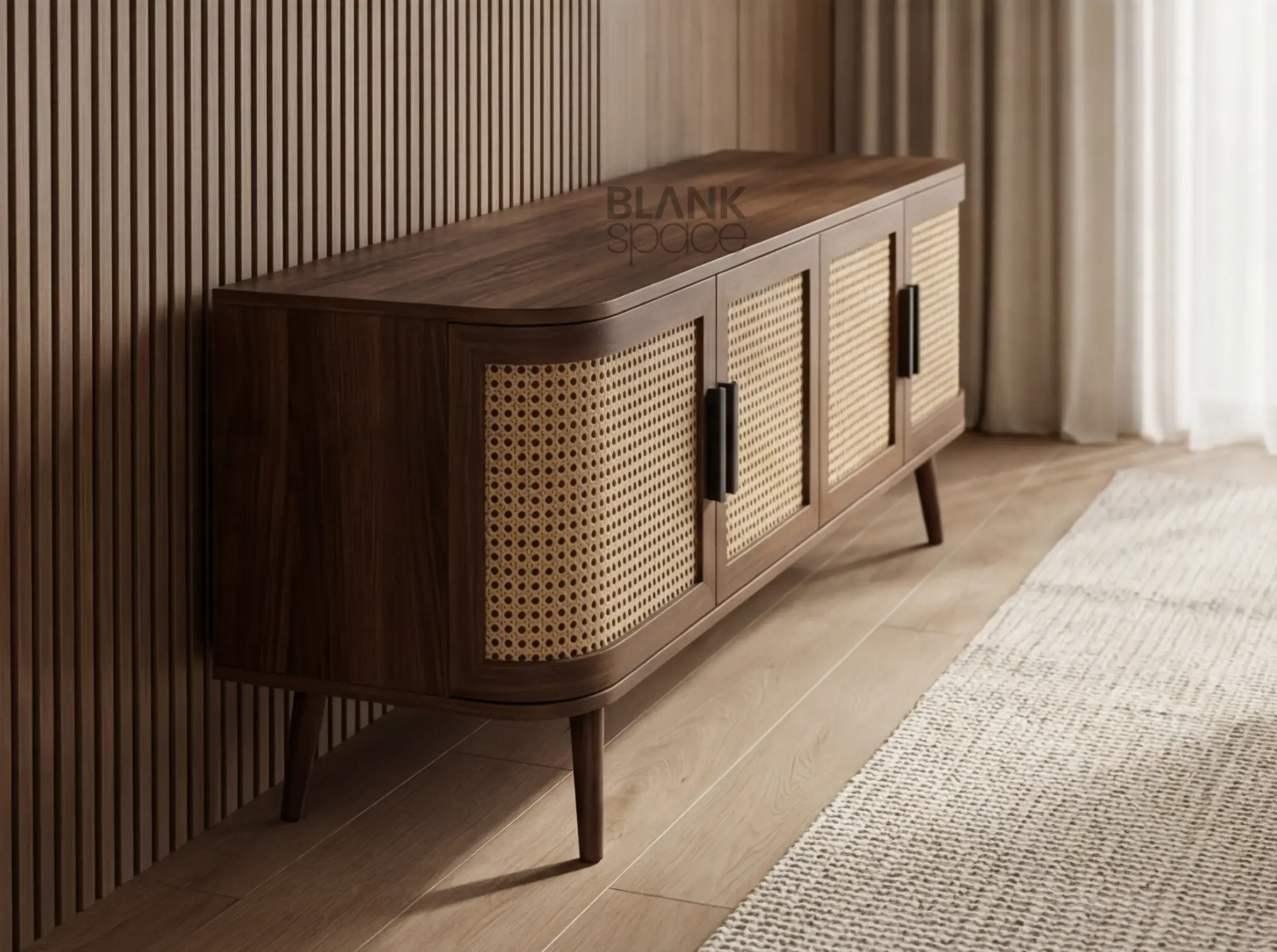 Built for both style and function, the console offers generous concealed storage for media equipment, books, and everyday essentials—keeping living spaces uncluttered and composed. Raised on tapered wooden legs, the design feels light and elevated, allowing it to integrate effortlessly into modern and warm-minimal interiors.