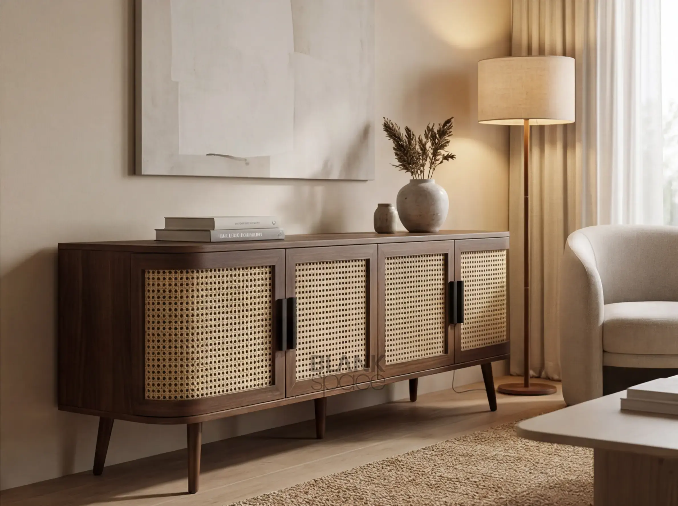 The Teakwood Cane Front Media Console is a seamless blend of contemporary form and artisanal detail. Its clean, elongated silhouette is softened by natural cane panel doors, creating visual rhythm while maintaining a calm, minimal aesthetic.
