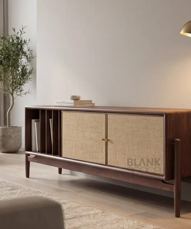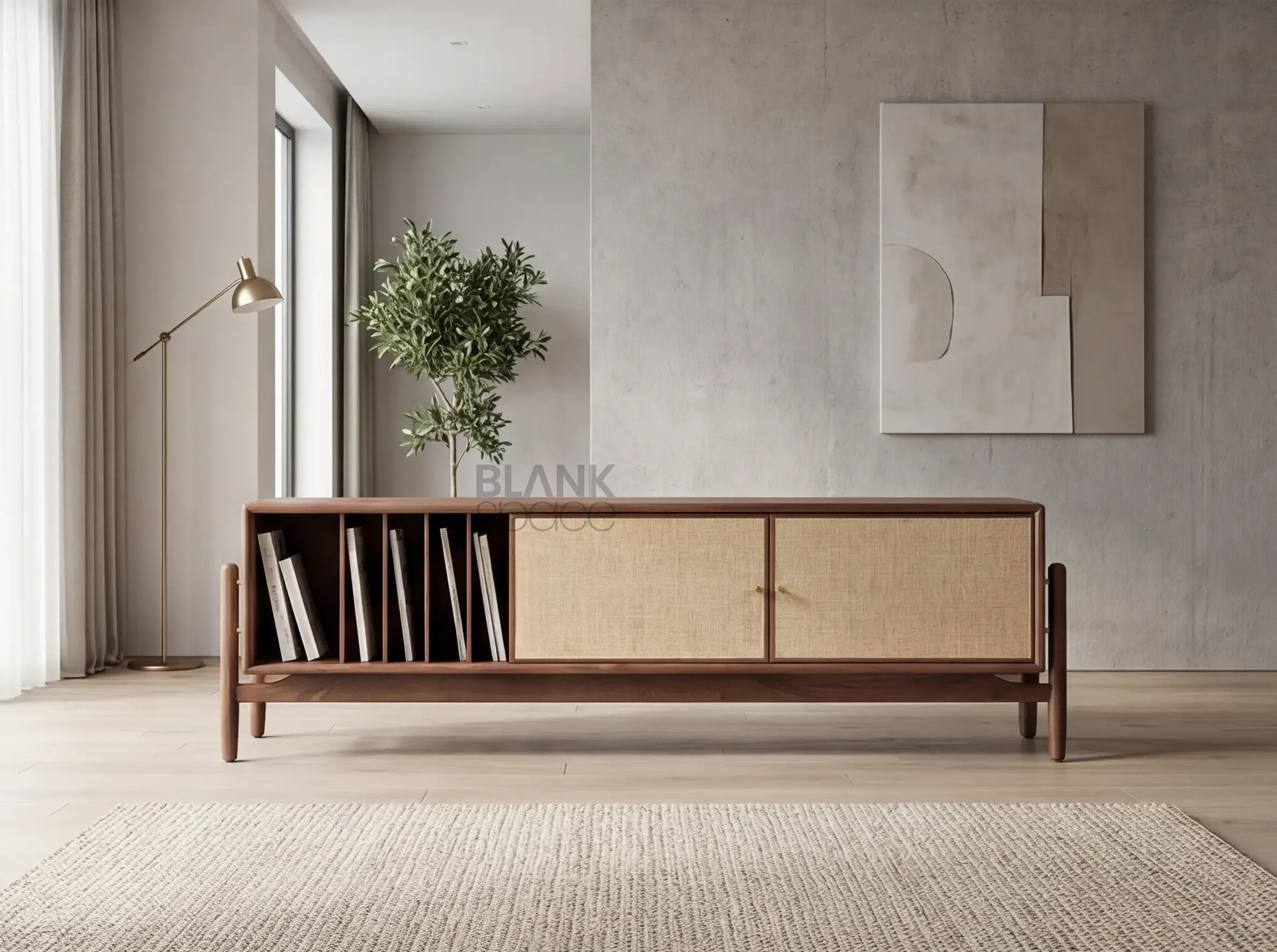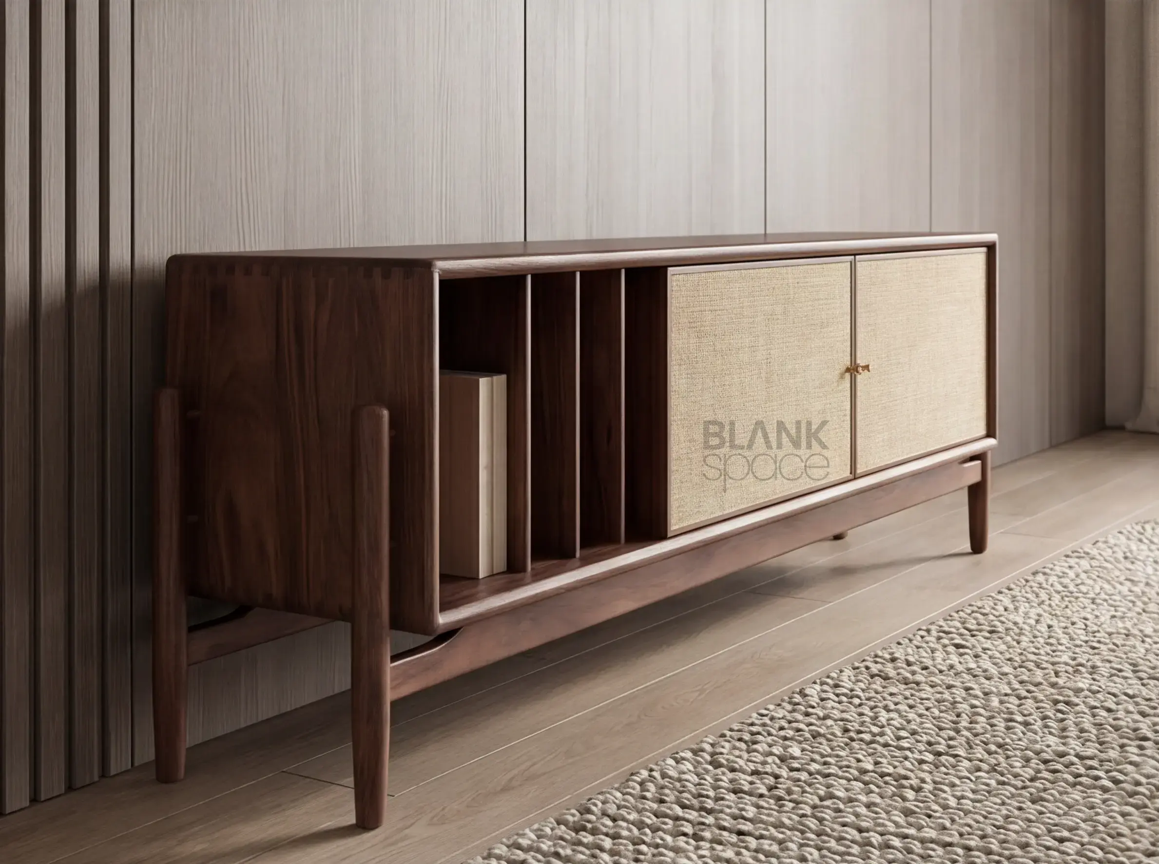 The Teakwood Cane Media Console is a sophisticated blend of functional storage and timeless design. Its clean, elongated silhouette is softened by natural cane panel doors, creating a warm visual rhythm that complements contemporary interiors.