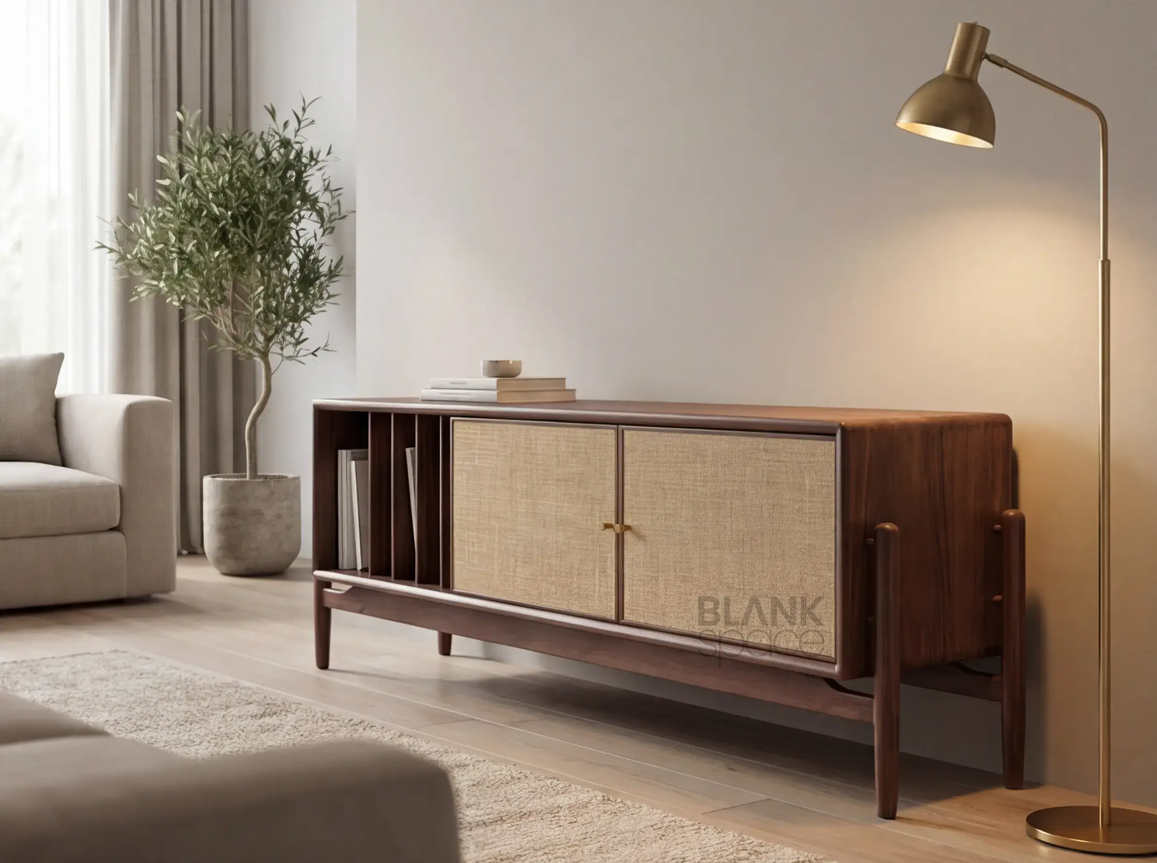 Solid teakwood media console with handcrafted cane shutters, offering breathable storage, durability, and a timeless modern aesthetic.